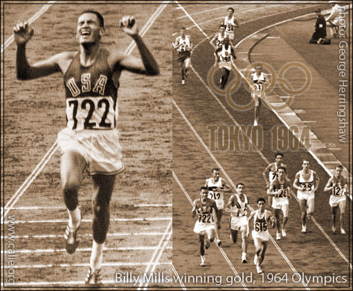 Games of the XVIII Olympiad, 1964 Tokyo Olympics — American Olympic athlete 1ST LT Billy Mills (Oglala Lakota Sioux, Pine Ridge Indian Reservation, South Dakota) photographed crossing the finish line in his historic Field & Track event (photo US Marine Corps). Photo right pictures Lt. Mills making his final dash for the lead to win the 10,000 meters at the Summer Olympics in Tokyo, Japan, 1964.