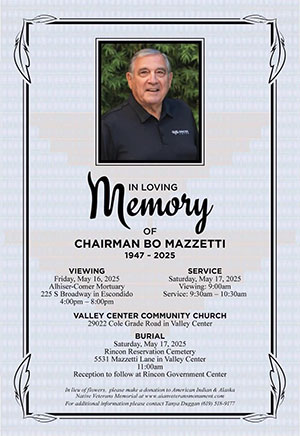 RINCON INDIAN RESERVATION -- Bo Mazzetti is the elected Chairman of the Rincon San Luiseño Band of Mission Indians. Mazzetti is one of the two Rincon delegates to the San Luis Rey Water Authority Board, a consortium of the La Jolla, Pala, Pauma, San Pasqual and Rincon Bands, formed to initiate a successful litigation to protect the five tribes’ water rights. He has served as a delegate to the California Nations Indian Gaming Association.