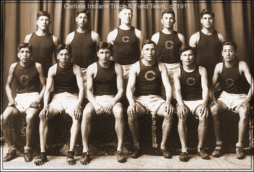 Carlisle Indians track and field team photo (c. 1911) pictures 1912 American Indian Olympians Jim Thorpe (standing center) and Lewis Tewanima (appears seated far left, but at least one credible website has him seated far right).