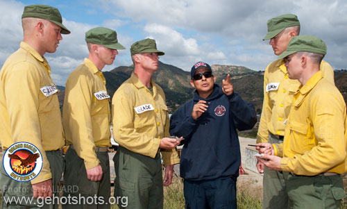 Fire-fighting students with heavy hose packs on their backs listened up to Captain Hopkins went over the plan just before they raced up the mountain laying hose the young man in the center with the fresh yellow uniform was a visiting Explorer, La Mesa Fire Dept.