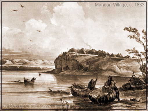 Mandan Indian village similar to the location and appearance of the aboriginal Native American Indian river settlement where Lewis and Clark first met Sacagawea in 1804. (Smithsonian Institution, artist: George Catlin color paintings and field notes)